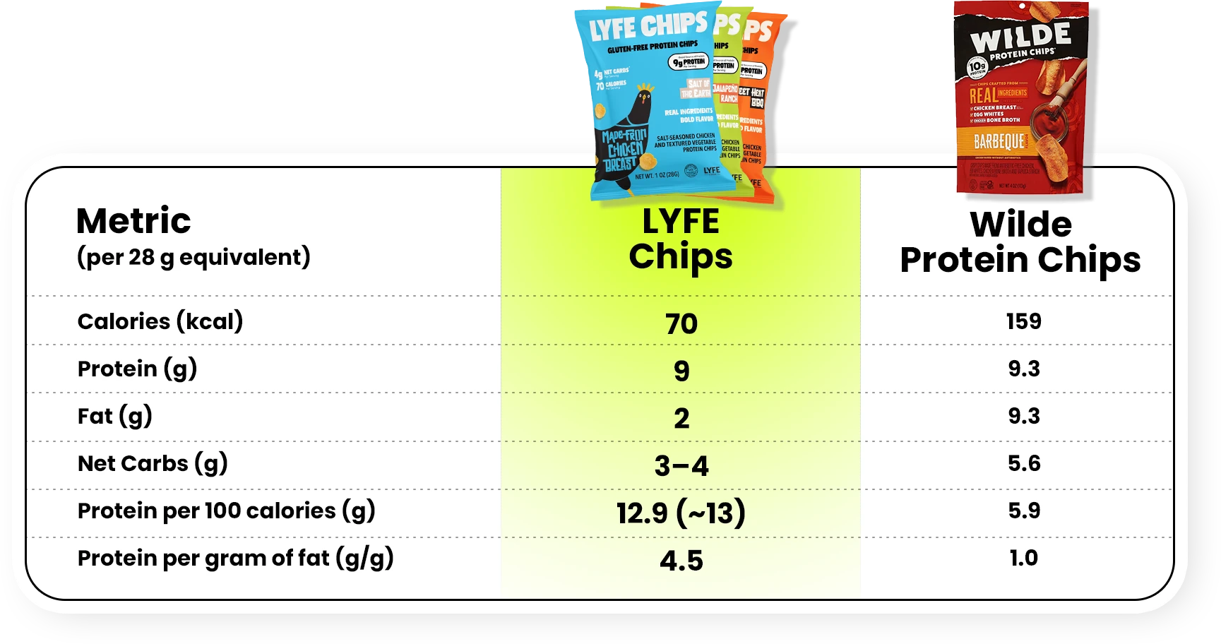 LYFE Chips sit among the most macro-efficient protein chips on the market. They are designed as one of the leanest options available, built for clean macros, with more protein per calorie than most protein snacks.