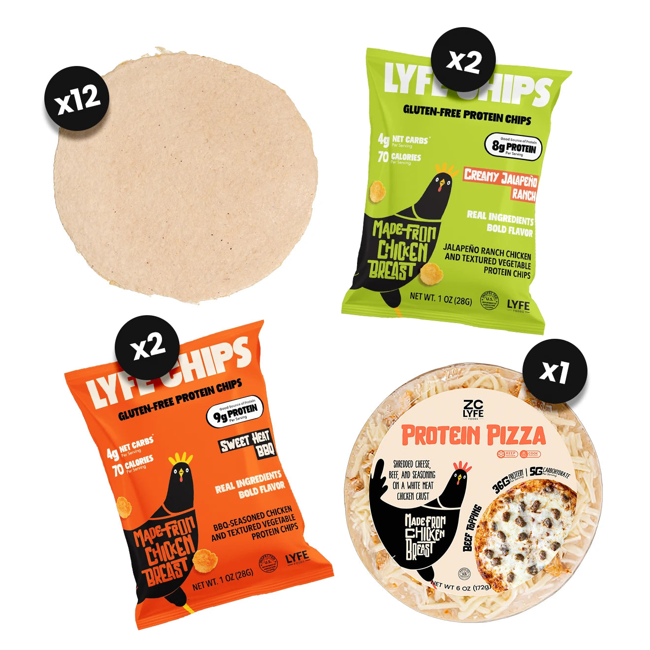 - 4 LYFE Chips (2 BBQ / 2 Jalapeño Ranch): protein-rich crunch for any craving